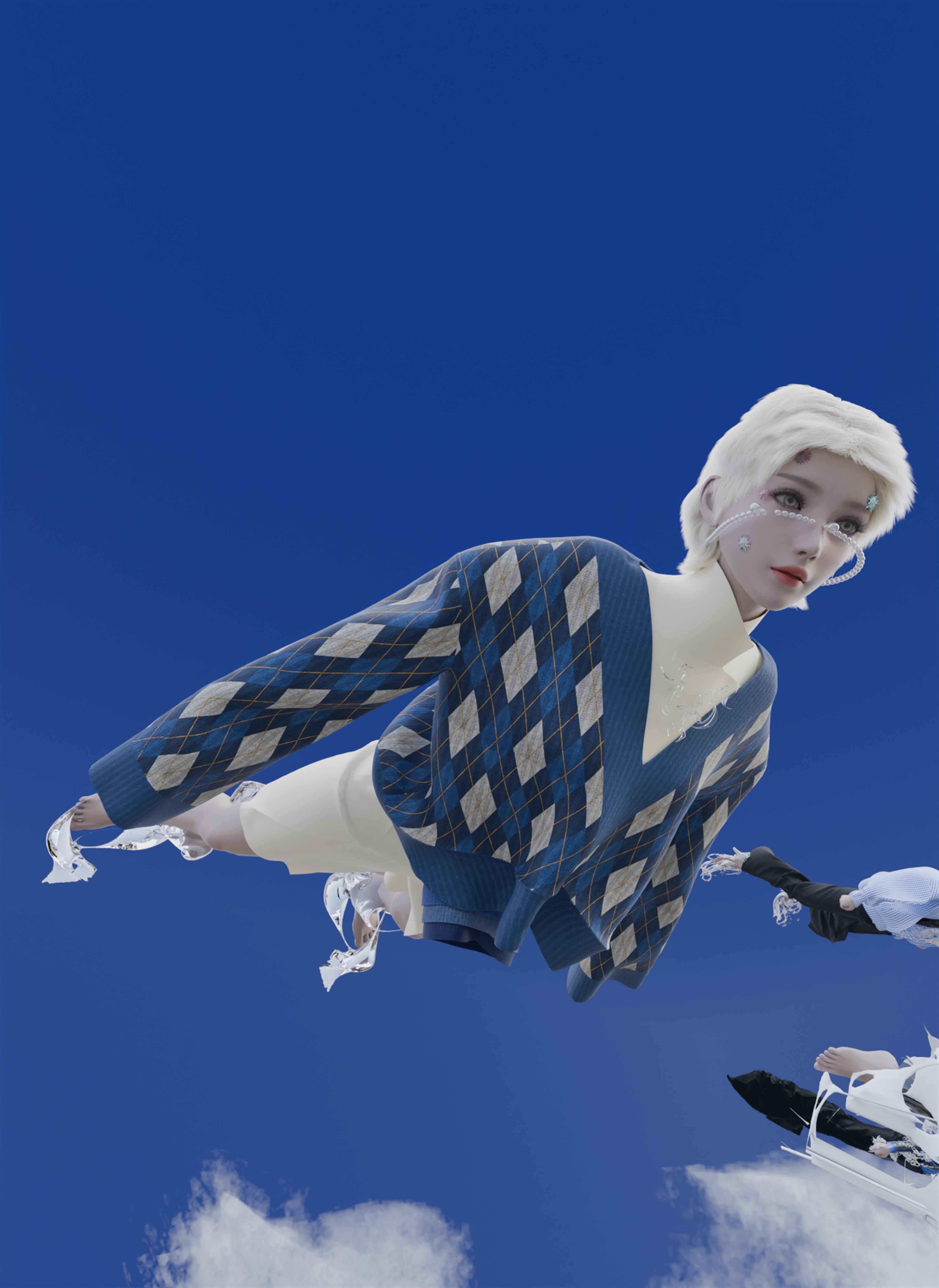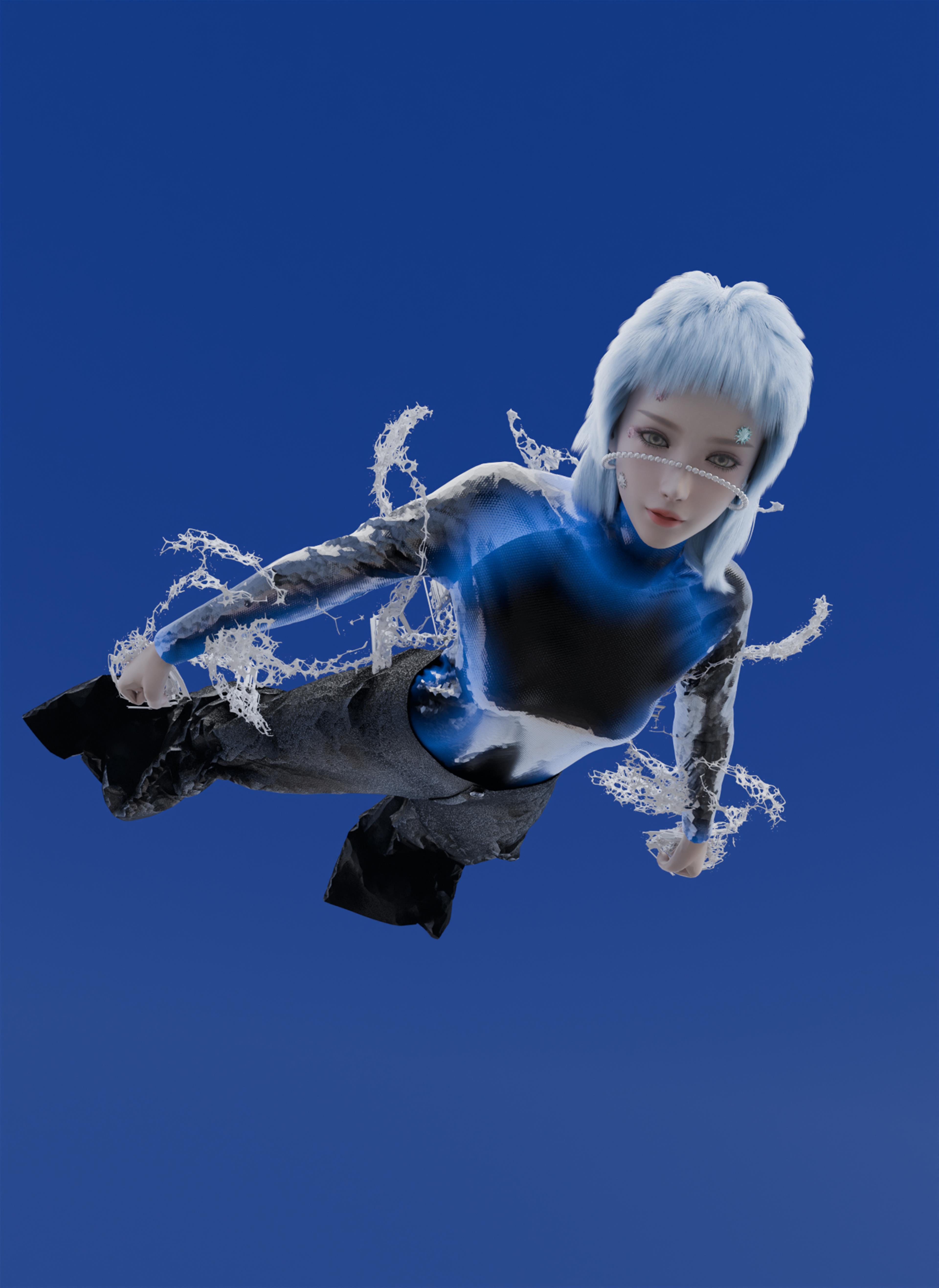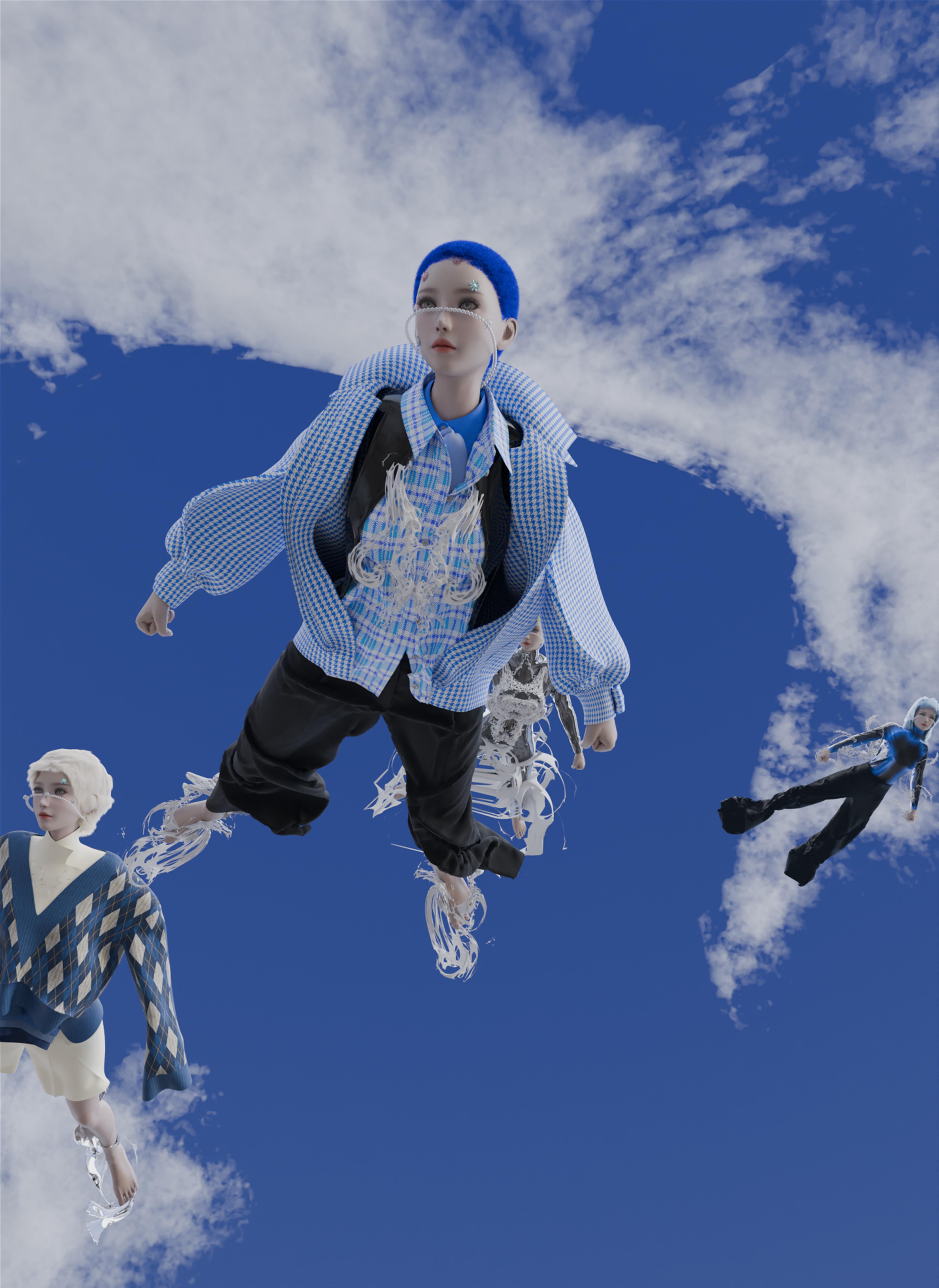 本系列以“天空”为主要灵感来源,致力于将无形的空气流动转化为可穿戴的虚拟结构。设计核心在于对动态的极致表达,通过线条与形态来捕捉风的轨迹。利落的流线剪裁模拟掠过肌肤的疾风,而参数化算法生成的扭曲立体褶裥则定格了空气中骤生的湍流与气旋。