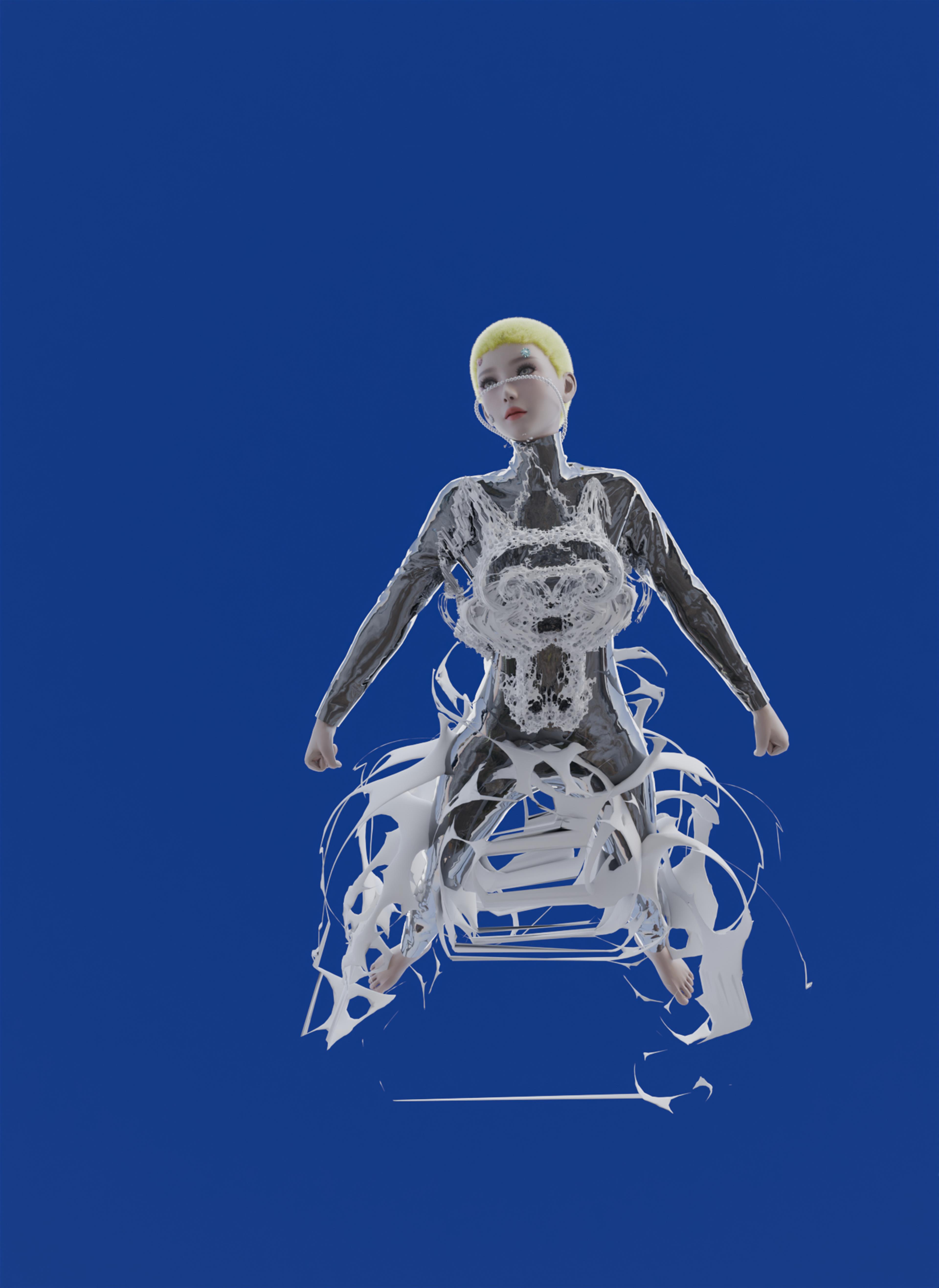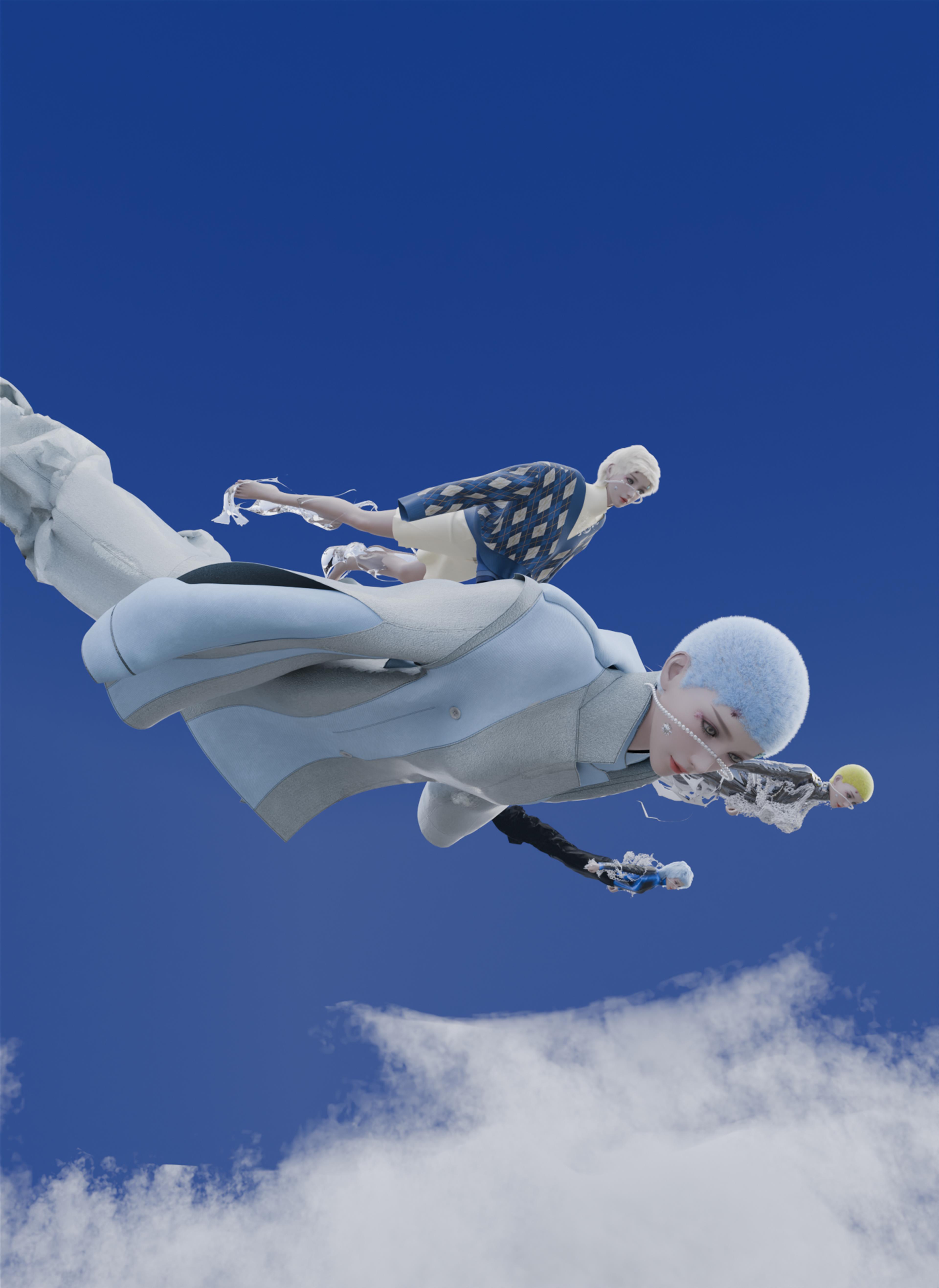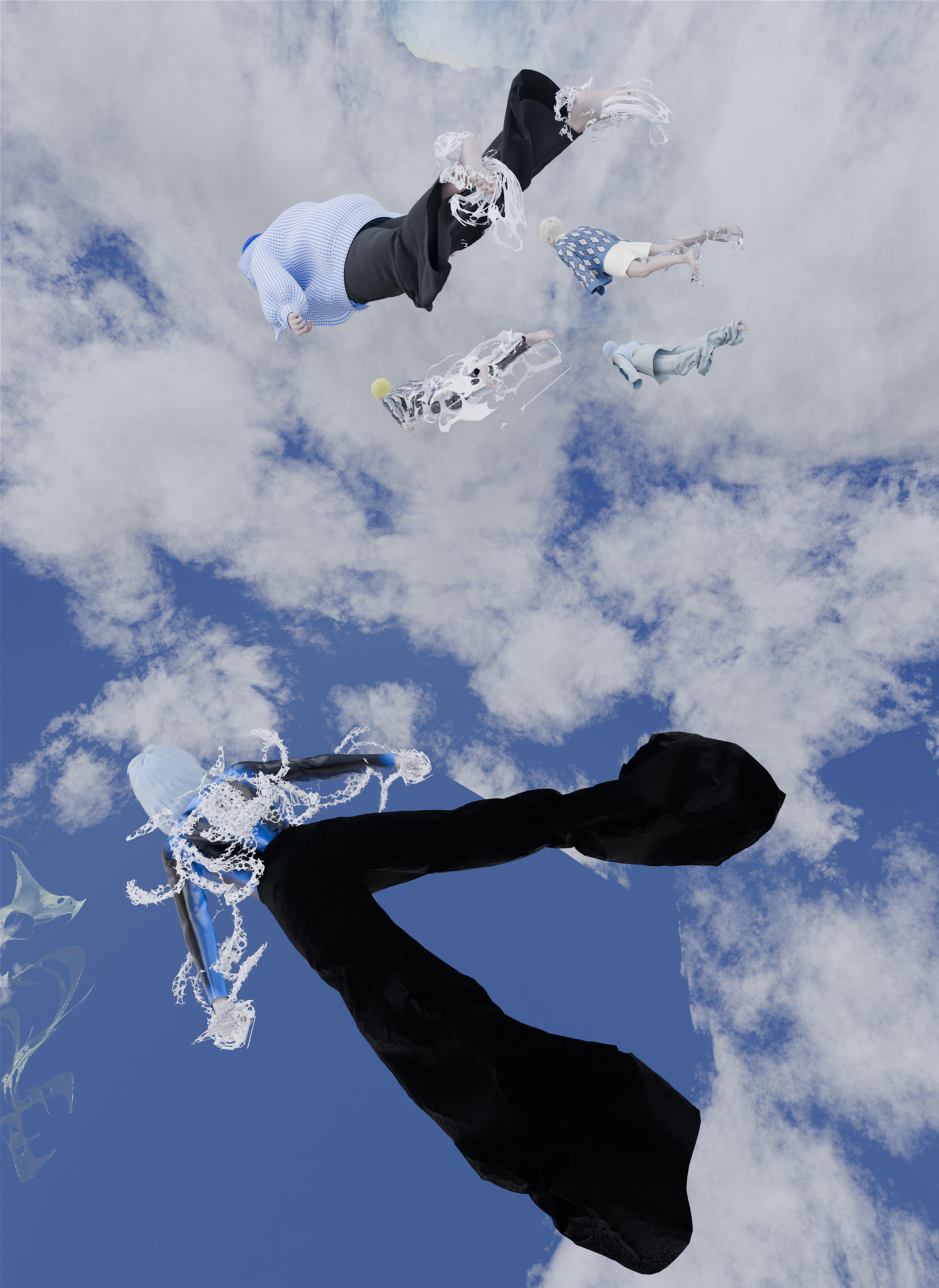 本系列以“天空”为主要灵感来源,致力于将无形的空气流动转化为可穿戴的虚拟结构。设计核心在于对动态的极致表达,通过线条与形态来捕捉风的轨迹。利落的流线剪裁模拟掠过肌肤的疾风,而参数化算法生成的扭曲立体褶裥则定格了空气中骤生的湍流与气旋。