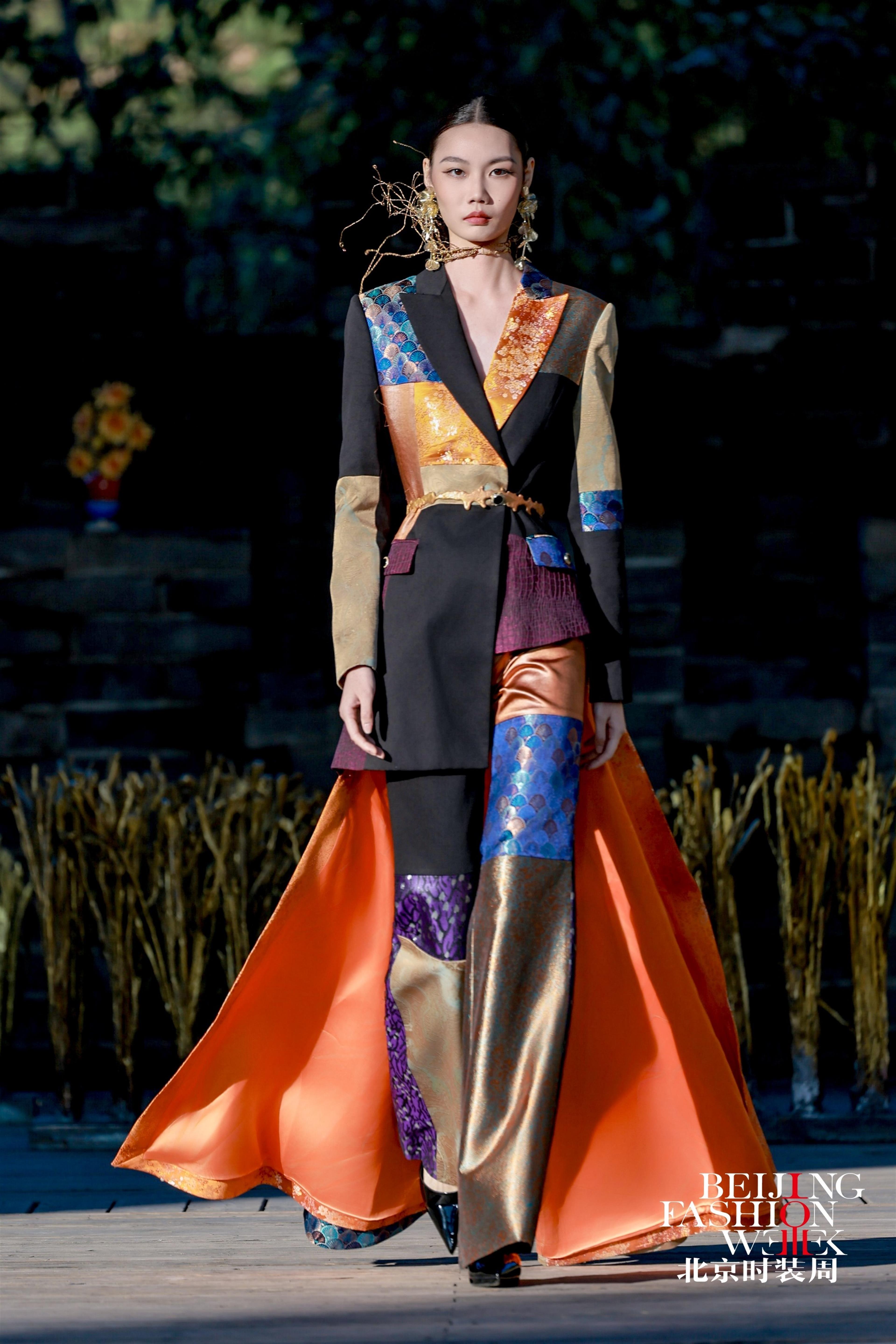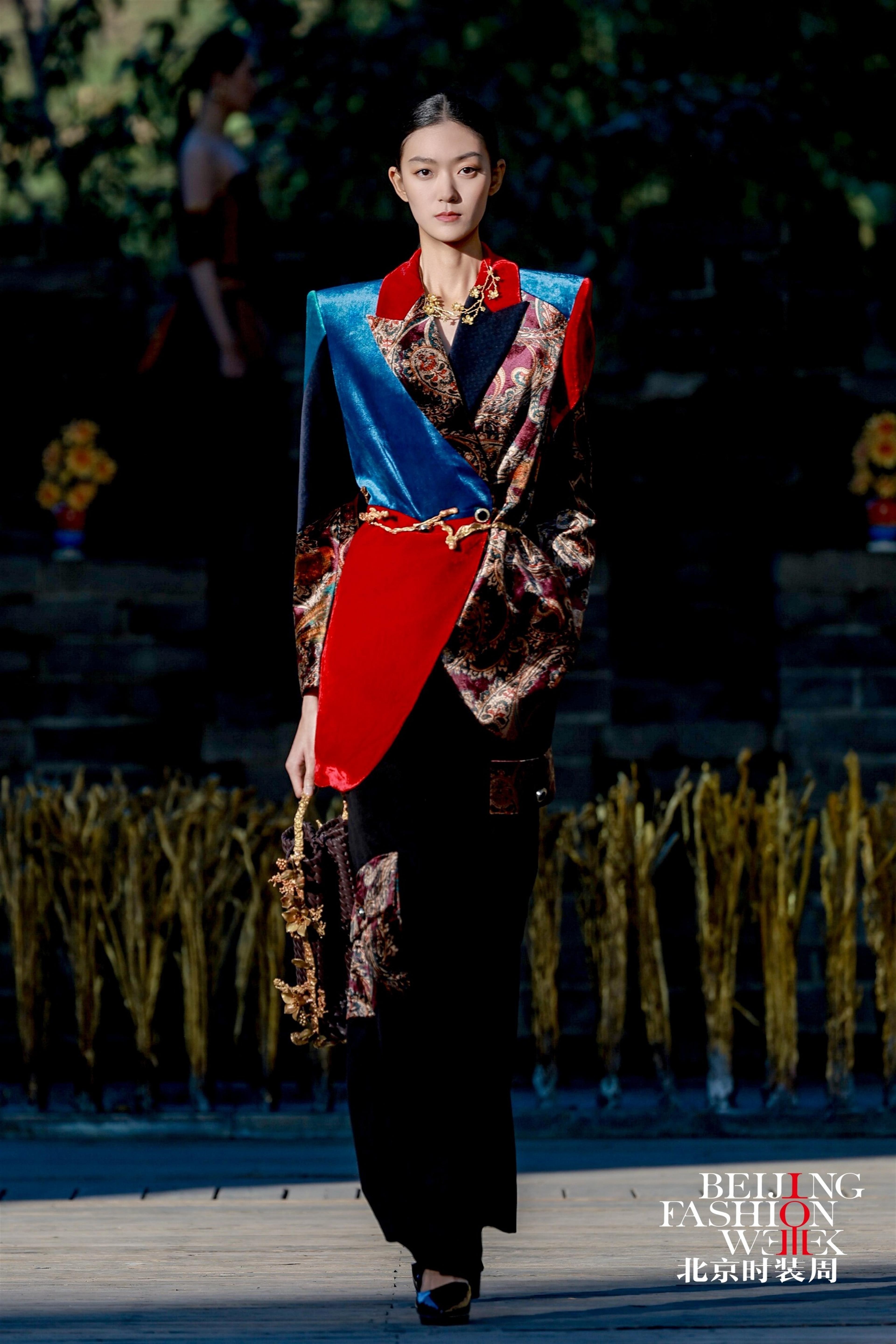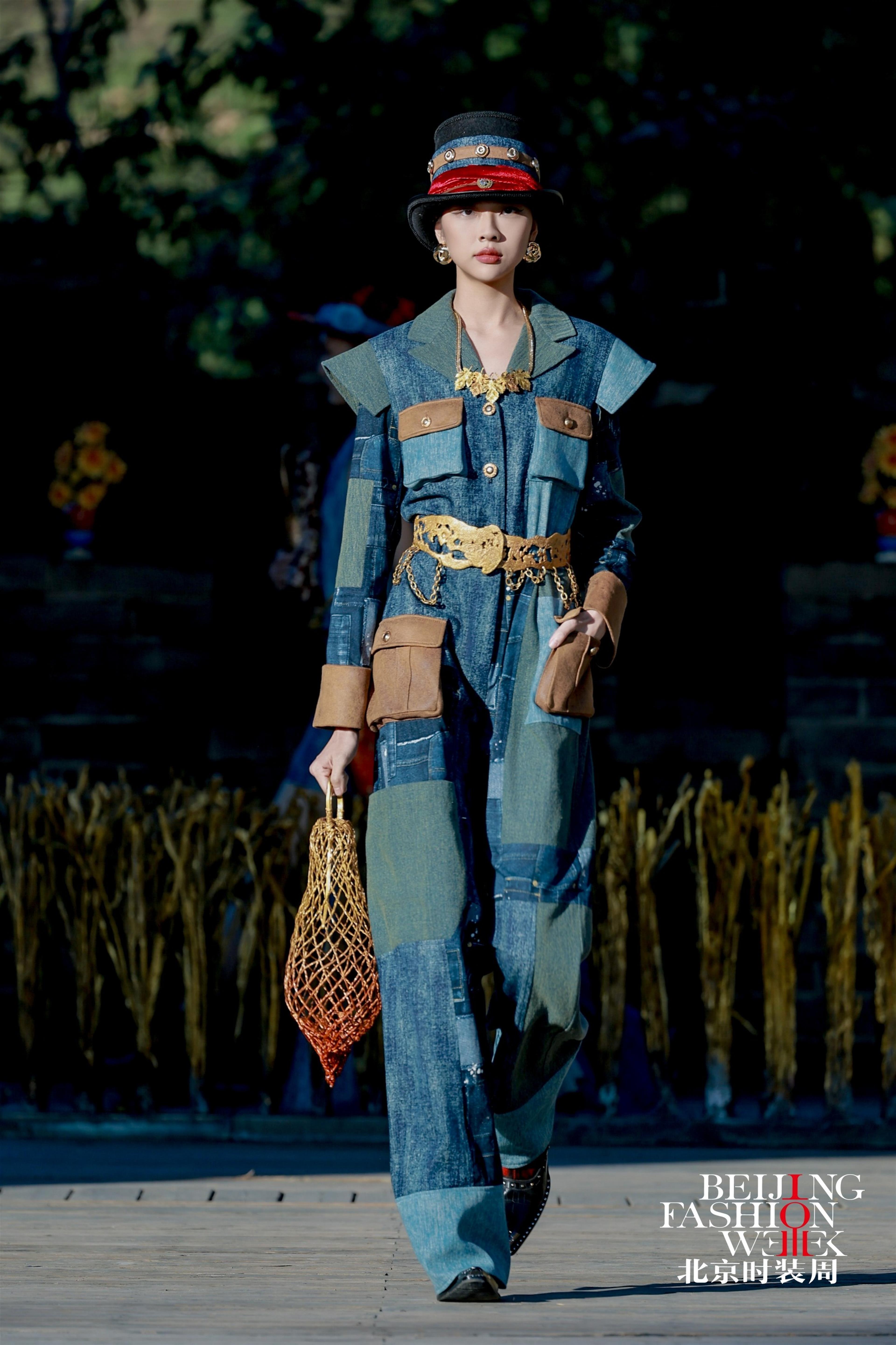 大秀以长城为天然幕布,模特们身着以匠人工装为原型重新解构的作品依次登场:工装立体袋、撞色走线与面料拼接的设计,精准模拟工装的补丁特点,既是对传统工装的致敬,也是一次创新。礼帽、臂环、手袋等配饰则用铜丝金属精心打造,透出刚柔并济的独特质感。 “艺术跨界有它强大的生命力”,朱炳仁坦言。他因承建杭州雷峰塔、峨眉山金顶等百座铜建筑项目,被誉为“中国铜建筑之父”。2006年,他首创熔铜艺术,为铜艺创作开辟自由新境界。一直以来,他还在书法、绘画、篆刻、诗歌等领域持续探索跨界。去年,他与REDMOON CHEN联合推出的“云墨熔装”亮相米兰时装周,此次“匠师熔装”为北京时装周闭幕式画上完美句号。 作为全国五一劳动奖章获得者,朱炳仁首次将匠人美学融入服装设计。他带来的砺本牛仔、匠构西装、熔彩织锦三大系列共50余套服装,以三幕式结构完整讲述了关于“匠心”的动人叙事。朱炳仁表示,这场专为劳动者创作的工匠之秀,是献给中国和世界所有劳动者的礼物。 秀场选址在雄伟壮丽的司马台长城,为大秀赋予了深刻文化内涵。时尚编导、秀导王红民介绍,秀场依托长城文化构建特色场景,秀中作品融入石马、射箭等游牧民族文化符号,彰显多元文化的共生共融。 大秀以“熔”为核心理念,含“包容”之意。在秀场现场,朱炳仁的《燃烧的向日葵·国葵》《庚彩水果系列》《稻可道,非常稻》等经典熔铜作品同步亮相。“国葵”寓意代代向好,巨型“庚彩水果”象征秋日收获,吸引观众纷纷打卡拍照。走秀环节中,模特手持向日葵种子播种于土壤,与向日葵作品呼应,隐喻艺术的传承与绽放。 朱炳仁说:“我希望通过这些作品,打破‘工装=廉价’‘时装=疏离’的偏见,让工艺回归灵魂,让设计承载人文,让时装成为连接历史、当下与未来的桥梁。”这场“匠师熔装”大秀,为北京时装周十周年写下浓墨重彩的一笔。